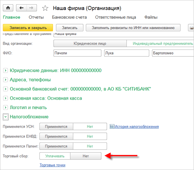 В настройках налогообложения организации необходимо включить непосредственно сам торговый сбор: