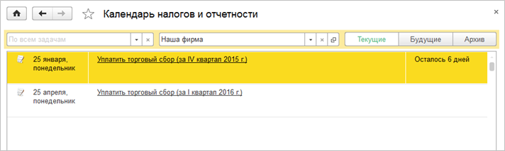 После определения всех торговых точек становится доступна задача календаря подготовки отчетности по торговому сбору.