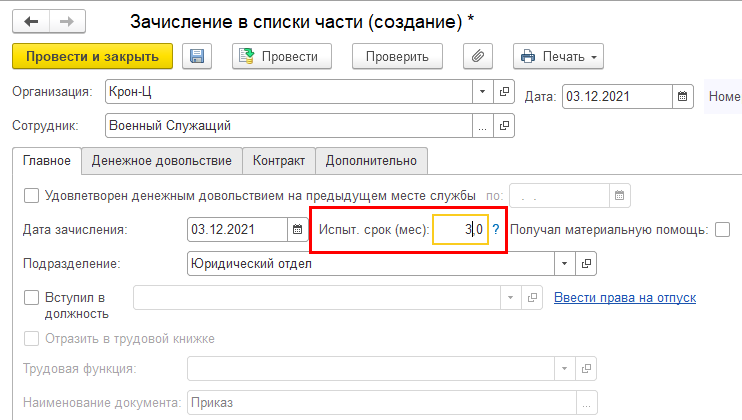 Добавлена возможность указания продолжительности испытательного срока для военнослужащих при зачислении в списки части.