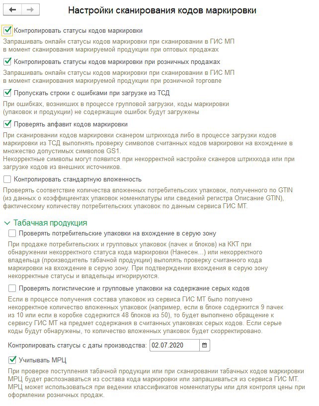 Это означает, что табачная продукция может не числиться за продавцом на момент совершение операции. Для учета этого исключения в форме Настройки сканирования кодов маркировки в группе Табачная продукция предусмотрен реквизит Контролировать статусы с даты производства. Произведенная до указанной даты табачная продукция считается исключением и статусы по ней не проверяются. Для продукции, произведенной начиная с указанной даты, статусы проверяются по общему правилу.