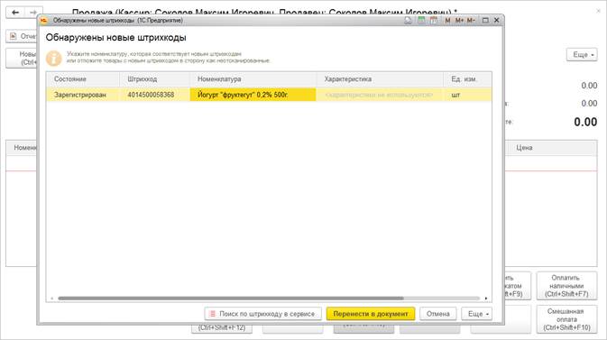 Если при оформлении документов ввести или считать незарегистрированный в прикладном решении штрихкод, то откроется форма, в которой можно зарегистрировать новые штрихкоды. Для этого необходимо выбрать элемент справочника номенклатуры, соответствующую новому штрихкоду.