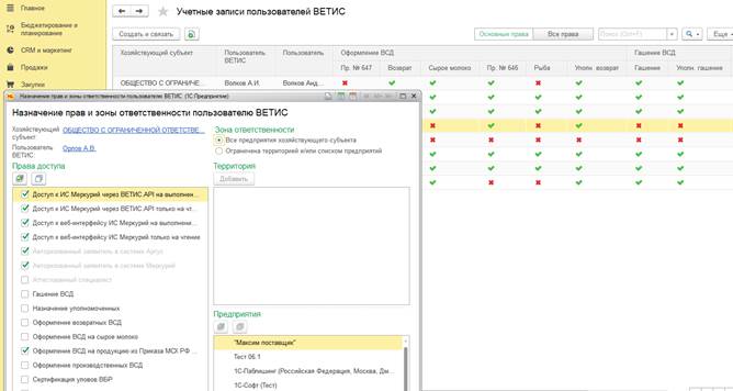 Для обмена с ВЕТИС пользователю можно назначить права, в соответствии с теми операциями, которые ему необходимо отражать. Наличие определенных прав позволит пользователю оформлять конкретные операции. Предусмотрены следующие права (роли):