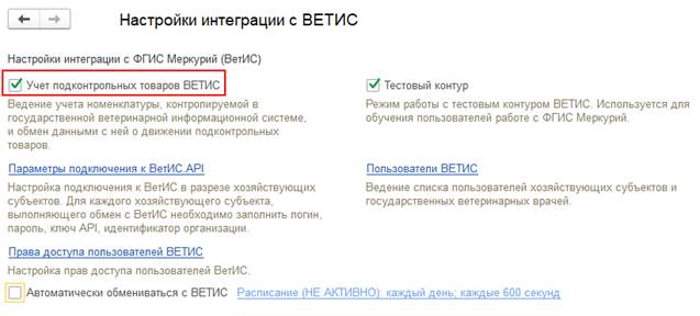 Дополнительно предусмотрена настройка расписания для автоматического обмена данными с ВЕТИС (флаг Автоматически обмениваться с ВЕТИС).