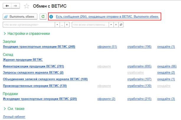 В соответствии с установленными отборами на форме обмена с ВЕТИС напротив каждого вида документов ВЕТИС показываются гиперссылки с информацией о количестве документов, по которым требуются действия:
