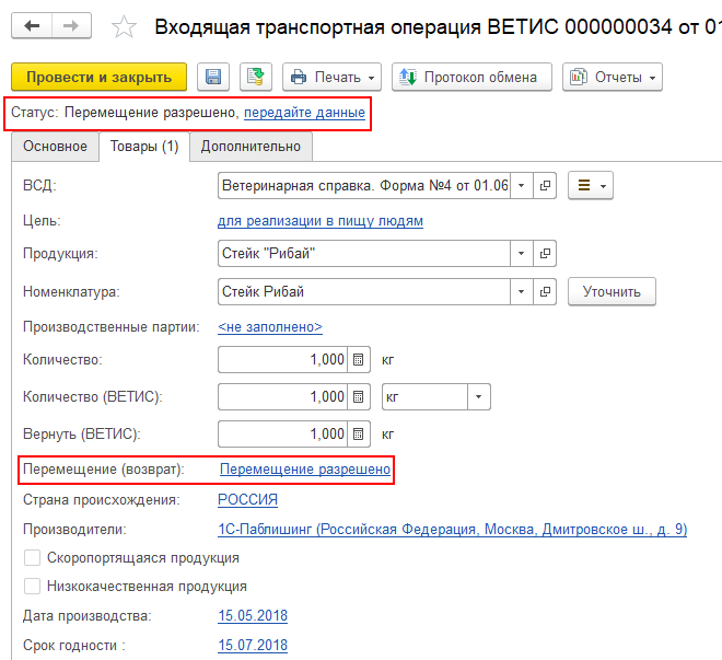 В момент оформления входящей транспортной операцией есть возможность сопоставить продукцию ВЕТИС и соответствующую ей номенклатуру в информационной базе (команда Уточнить).