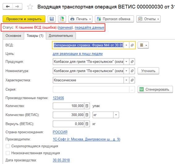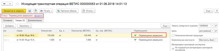На каждую продукцию оформляется отдельный документ по входящей транспортной операции. Гашение ветеринарного сертификата выполняется на каждую продукцию ВЕТИС в отдельности. По результату гашения ветеринарного сертификата формируется новая запись журнала на предприятие-получателя.