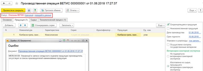 Элементы справочника Продукция ВЕТИС сопоставляются со справочниками Номенклатура, Характеристика номенклатуры и сериями номенклатуры в информационной базе. Сопоставление возможно отдельно для каждой партии, идентифицируемой записью складского журнала.