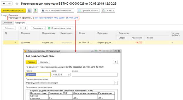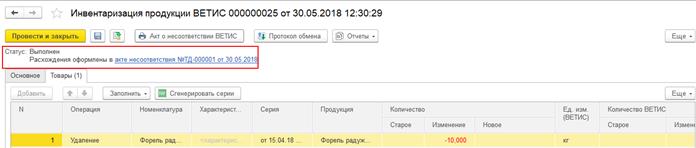 Выявленные расхождения заполняются в акте несоответствия, форма которого доступна по соответствующей гиперссылке на форме документа инвентаризации.