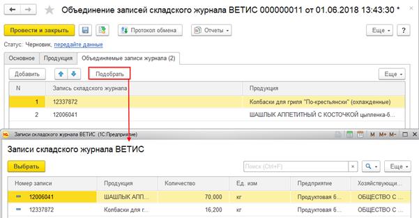 Указываются записи складского журнала ВЕТИС, которые будут объединены в одну запись складского журнала (команда Подобрать).