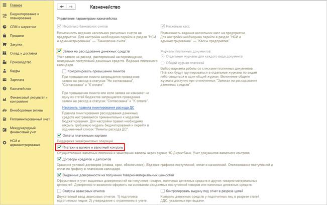 Для начала работы требуется включение функциональной опции НСИ и администрирование – Казначейство - Платежи в валюте и валютный контроль.