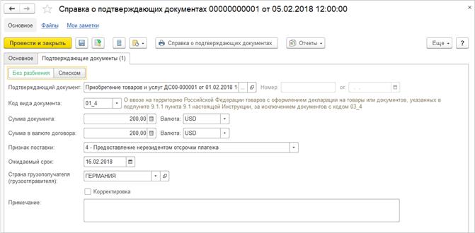 Для формирования формы Справки о подтверждающих документах необходимо внести требуемые данные на вкладках Основное и Подтверждающие документы, а также по ссылке Файлы для передачи в банк приложить электронные копии подтверждающих документов (счета, акты, накладные, ГТД, письма в банк и пр.).