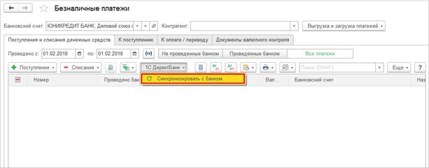 Данное уведомление оформляется специалистом банка и может быть загружено в информационную базу из рабочего места Казначейство – Банк – Безналичные платежи в процессе сеанса прямого обмена с банком по команде 1С:ДиректБанк – Синхронизировать с банком.