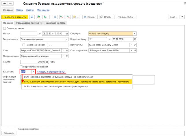 Аналогично документам списания безналичных денежных средств, ввод данных о способе оплаты комиссии и инструкциях банку, возможен при создании в иностранной валюте документа Заявка на расходование денежных средств.