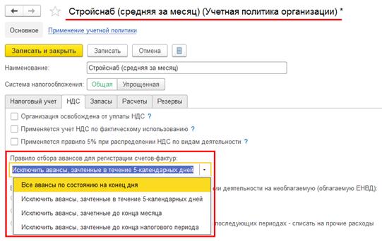 Организовано управление периодом зачета полученных авансов при определении необходимости формирования документов Счет-фактура выданный (аванс). В карточку учетной политики добавлена настройка Правило отбора авансов для регистрации счетов-фактур.