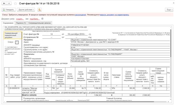 В случае, если проверка прошла успешно требуется утвердить полученный электронный УПД из рабочего места ЭДО.