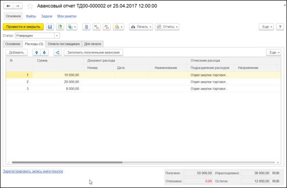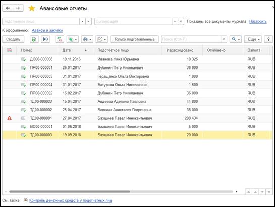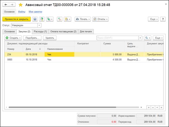 Журнал авансовых отчетов в колонке Израсходовано отражает не только сумму расходов, отраженных в самом документе Авансовый отчет, но и включает в себя сумму по документам Приобретение товаров и услуг.