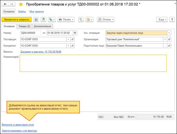 Добавлена возможность указания контрагента, от которого происходит закупка товаров и услуг, а также указание НДС в документе, и регистрация счета-фактуры.