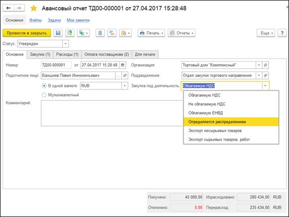Отнести расходы, отраженные авансовым отчетом, теперь можно не только на деятельность, облагаемую НДС или необлагаемую НДС. Теперь можно указать, что расходы будут отражены согласно внесенного в систему документа, распределяющего НДС – Распределение НДС.