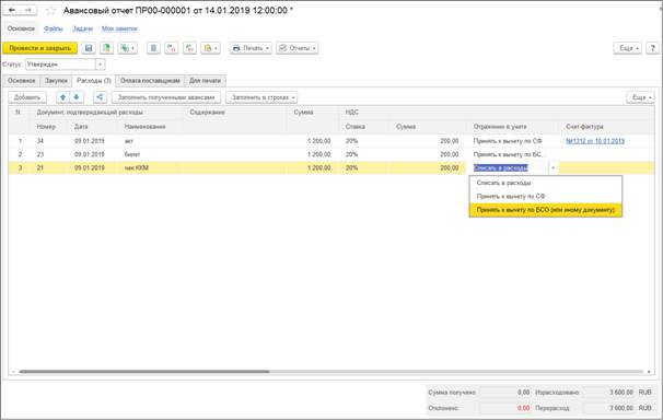 В документе Авансовый отчет появилась закладка Закупки, и в нее могут быть подобраны или созданы документы Приобретения товаров и услуг с операциями закупки от подотчетного лица. Удаление строки из табличной части отвязывает документ закупки от авансового отчета. Теперь вся работа с АО возможна в едином месте для всех видов отчета: закупки, расходы, оплаты поставщикам.
