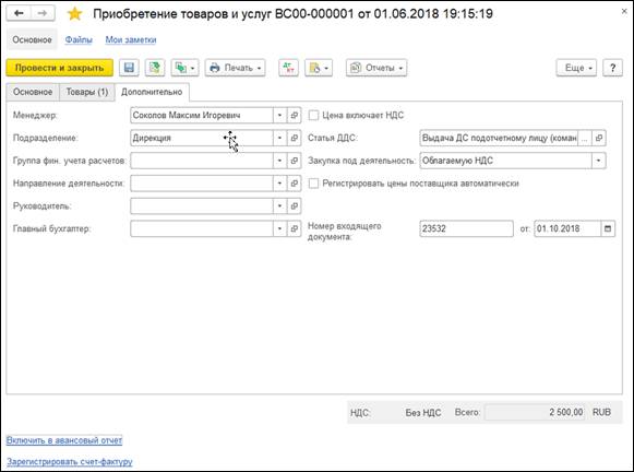 На закладке Дополнительно можно указать, под какую деятельность приходуются товары или услуги: облагаемую НДС или не облагаемую.