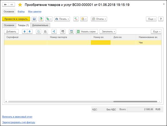 В случае наличия счета-фактуры поставщика, потребуется указать контрагента и зарегистрировать счет-фактуру.
