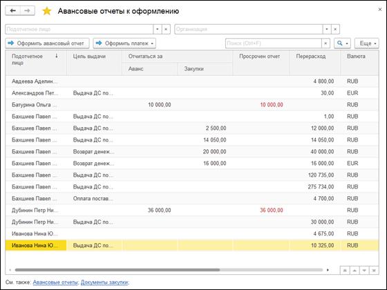 Рабочее место по оформлению авансовых отчетов открывается по гиперссылке К оформлению: Авансы и закупки и содержит теперь суммы по документам закупки, на которые не оформлен еще авансовый отчет. Это позволяет отслеживать документы закупки, созданные вне АО и не включенные в АО.