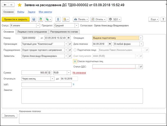 Заявки по списку подотчетных лиц оплачиваются через автоматическое создание платежных документов или кассовых ордеров по числу подотчетников.