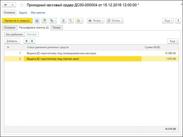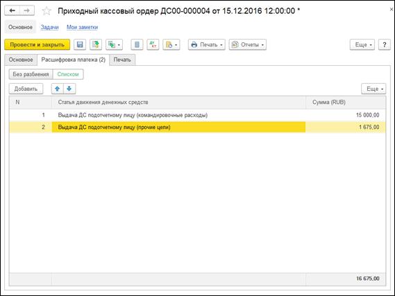 Если же выплата производится одному подотчетному лицу, в этом случае на закладке Расшифровка платежа можно указать список разных статей ДДС.