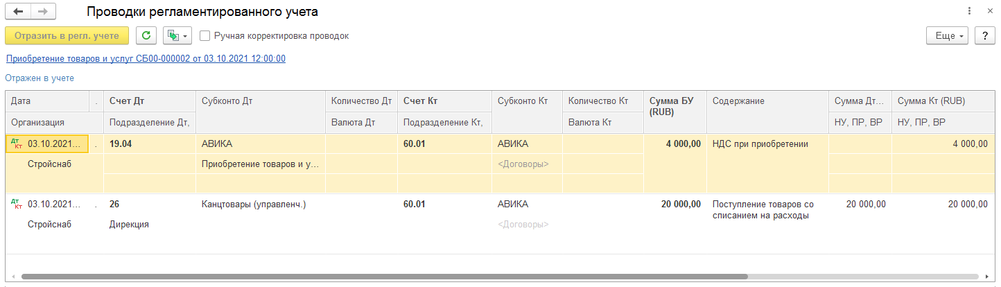 При отражении документа приобретения в регламентированном учете формируются проводки по отнесению стоимости ТМЦ на расходы.