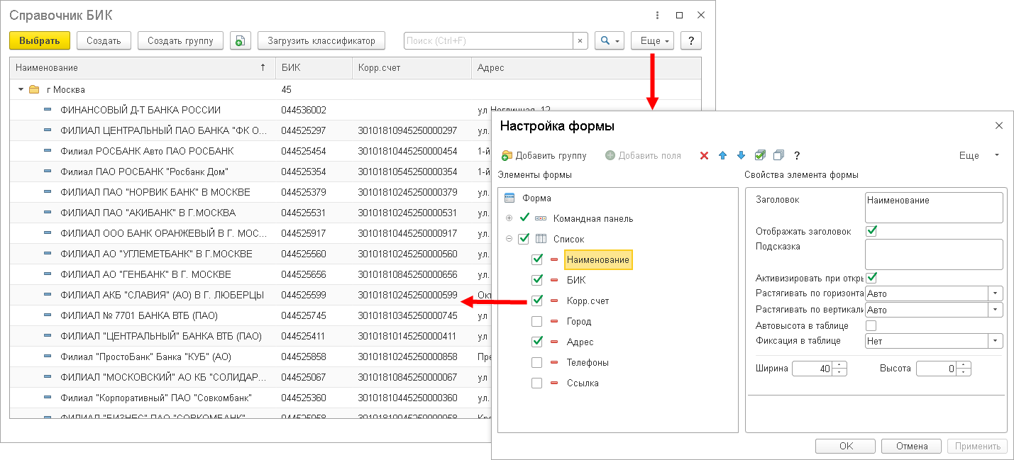 информация. В списке выбора банка колонка Корр.