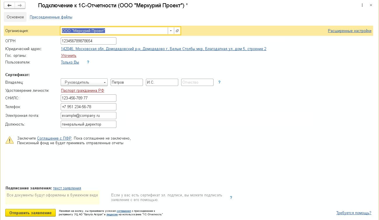 1С-Отчетности и данные ответственного сотрудника.