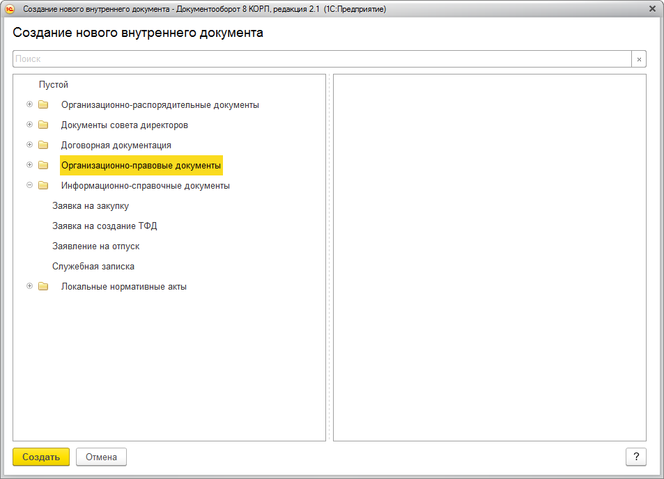 Теперь в помощнике создания новых документов по шаблонам отображаются папки видов документов.