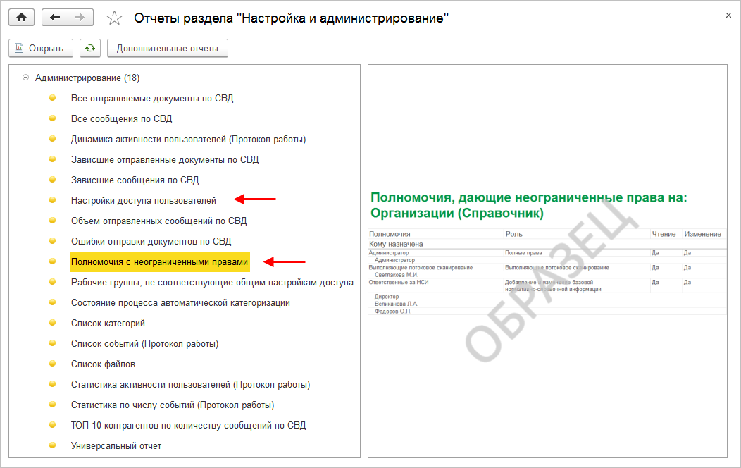 Отчеты Настройки доступа пользователей и Полномочия с неограниченными правами теперь можно открыть из панели отчетов раздела Настройка и администрирование.