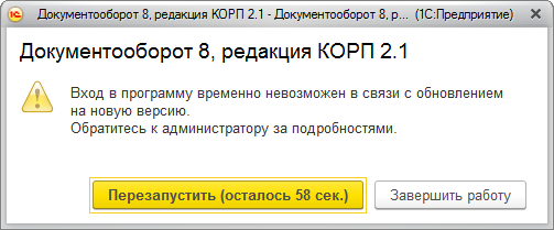 Обратите внимание: при большом количестве документов обновление информационной базы на версию 2.1 может занять продолжительное время.