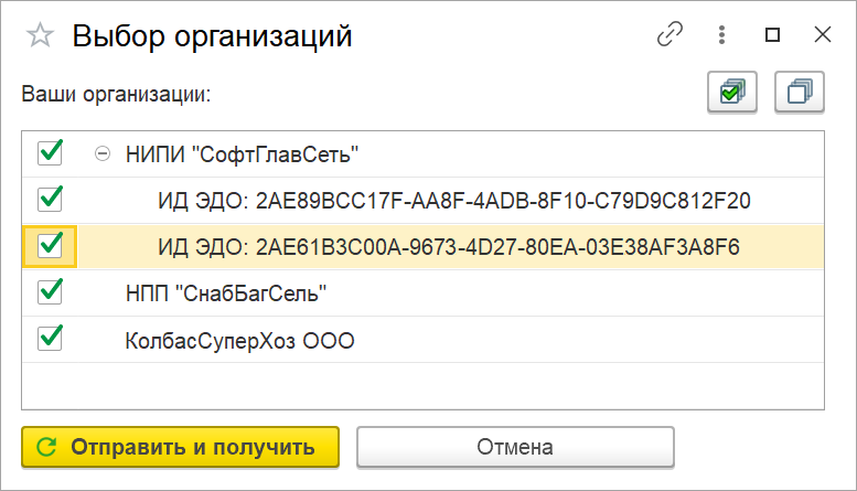 ● Реализована возможность отправки и получения электронных документов с отбором по организации. При первой отправке/получении документов после обновления появится окно с выбором данной возможности, если пользователю доступно несколько сертификатов для учетных записей организаций. В дальнейшем можно будет включить/отключить опцию в подменю «Ещё».