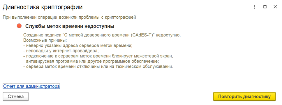 ● В диагностику криптографии добавлена проверка адресов меток доверенного времени. Теперь при отсутствии адресов меток доверенного времени или их недоступности в форме диагностики выводится соответствующее сообщение.