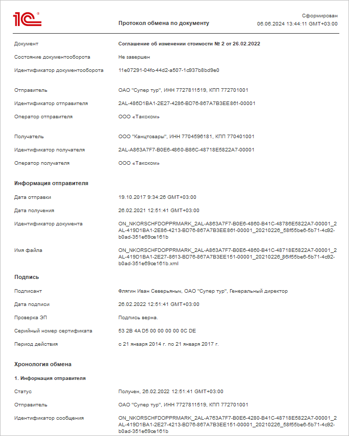 ● Реализована печатная форма «Протокол обмена», в которой представлена сводная информация о документообороте. Открыть ее можно во время просмотра электронного документа при установке соответствующего флага в меню «Печать электронных документов».