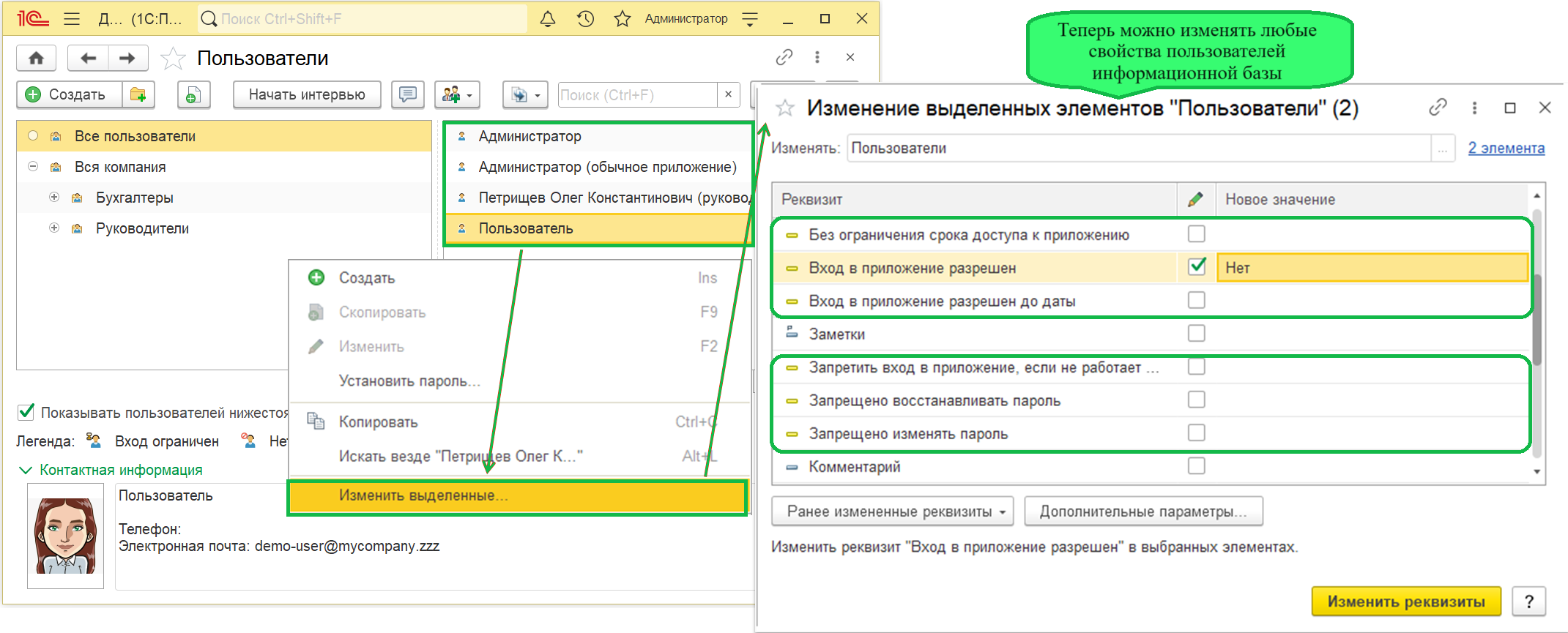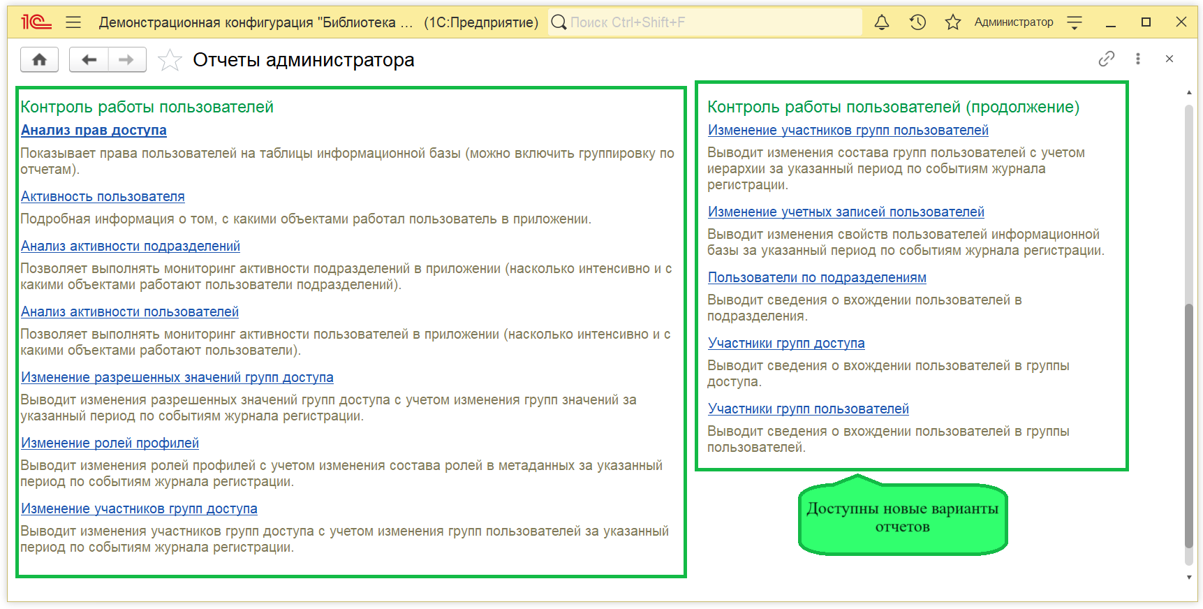 Теперь отчет Анализ прав доступа дополнительно выводит информацию о доступных неинтерактивных правах Чтение, Изменение и Добавление, с помощью которых можно получить доступ к данным неявным образом: программно с помощью расширений, внешних отчетов и обработок, через консоль запросов и т.п. Эти уточнения выводятся в тех случаях, когда в ролях выключены соответствующие интерактивные права Просмотр, Редактирование и Интерактивное добавление. К отчету можно перейти из раздела Администрирование - Отчеты администратора.