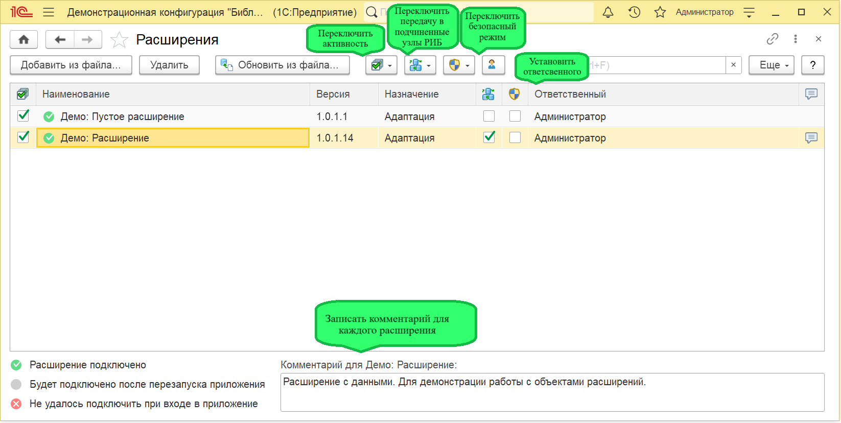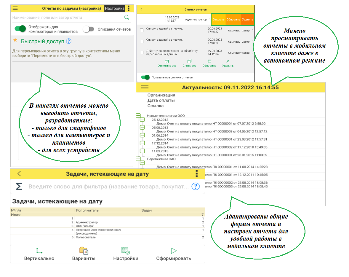 СнимкиОтчетов. См. примеры его использования в общем модуле _ДемоОбменМобильныйКлиент.ВариантыОтчетовПереопределяемый.ПередДобавлениемКомандОтчетов при определении команд отчетов, можно установить свойство Неконтекстный. Если Истина, то будут доступны для выбора другие варианты этого отчета, возможность добавления в избранное, получение ссылки на вариант отчета. Значение по умолчанию: Ложь.ПодключитьКомпонентуИзМакета и функция ПодключитьКомпонентуИзМакетаАсинх общего модуля ОбщегоНазначенияКлиент теперь возвращают символическое имя и местоположение, из которого была подключена компонента: имя макета или навигационную ссылку на внешнюю компоненту из справочника, если ее версия выше. Используя символическое имя и местоположение, можно проверять подключение компоненты методом платформы ПроверитьПодключениеВнешнейКомпоненты.ПодключитьКомпонентуИзМакета и функции ПодключитьКомпонентуИзМакетаАсинх общего модуля ОбщегоНазначенияКлиент теперь необязательно показывать предложение об установке, а сразу начинать установку компоненты. Для этого в функции-конструкторе ПараметрыПодключенияКомпоненты этого же общего модуля предусмотрено свойство ПоказыватьВопросУстановки. Его рекомендуется указывать лишь в случаях, когда дополнительное информирование об установке компоненты избыточно (например, уже проинформировали ранее).ЗащитаПерсональныхДанных.УдалитьИнформациюОбУничтоженииПерсональныхДанных.ЗащитаПерсональныхДанных.СубъектыСИстекшимСрокомХранения можно получить субъекты с истекшим сроком хранения персональных данных.РаспознатьАдрес в процедуре ДобавитьКонтактнуюИнформацию общего модуля УправлениеКонтактнойИнформацией теперь можно отключать распознавание адреса по его представлению согласно адресному классификатору ГАР. В этом случае представление адреса, переданное в параметре ЗначениеИлиПредставление, будет записано в информационную базу без значения полей этого адреса. Это может быть востребовано, когда хранение полей адреса в информационной базе избыточно.УправлениеКонтактнойИнформацией предусмотрены функции СведенияОбАдресе и СведенияОбАдресах. Эти функции возвращают адрес в структурированном виде, что упрощает его использование при оформлении заказов, доставок и интеграции с внешними сервисами, требующими точного указания адреса.