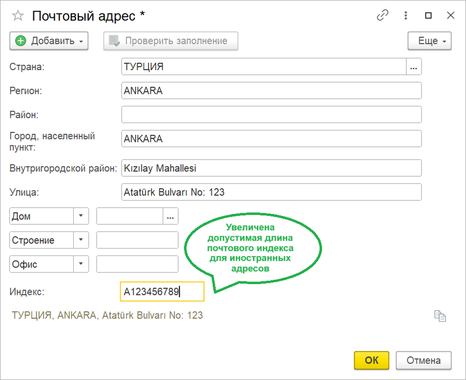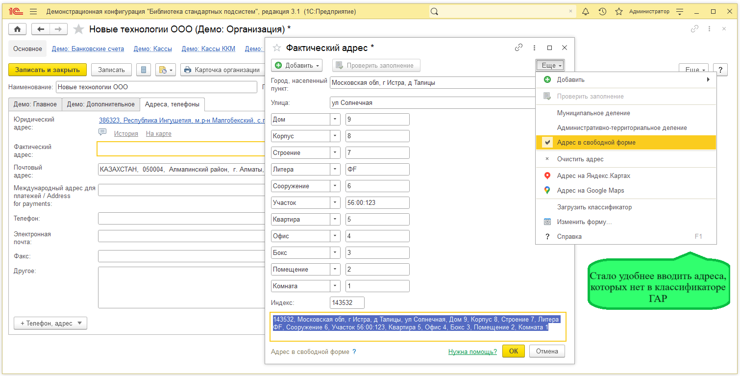 КонецЕслиРаботаСАдресами возвращаемое значение функций СведенияОбАдресе, СведенияОбАдресах.СведенияОбАдресеПриказМинфинаРФ171н дополнено полем ИдентификаторПомещения, которое содержит уникальный идентификатор адресного объекта для квартиры, офиса или иного помещения.?РаботаСАдресамиКлиентСервер предусмотрена функция-конструктор ПоляПомещения. УправлениеПечатьюПереопределяемый.ПриЗаполненииСпискаОбщихПолей. Пример см. в процедуре ПриЗаполненииСпискаОбщихПолей общего модуля УправлениеПечатьюПереопределяемый.Для переопределения собственной логики работы с файлами, размещенными в файловом архиве (например, для проверки их доступности и открытия пользовательской формы оформления заявки администратору при недоступности файла), добавлена переопределяемая процедура ПриВыполненииДействияСФайлом общего модуля РаботаСФайламиКлиентПереопределяемый.