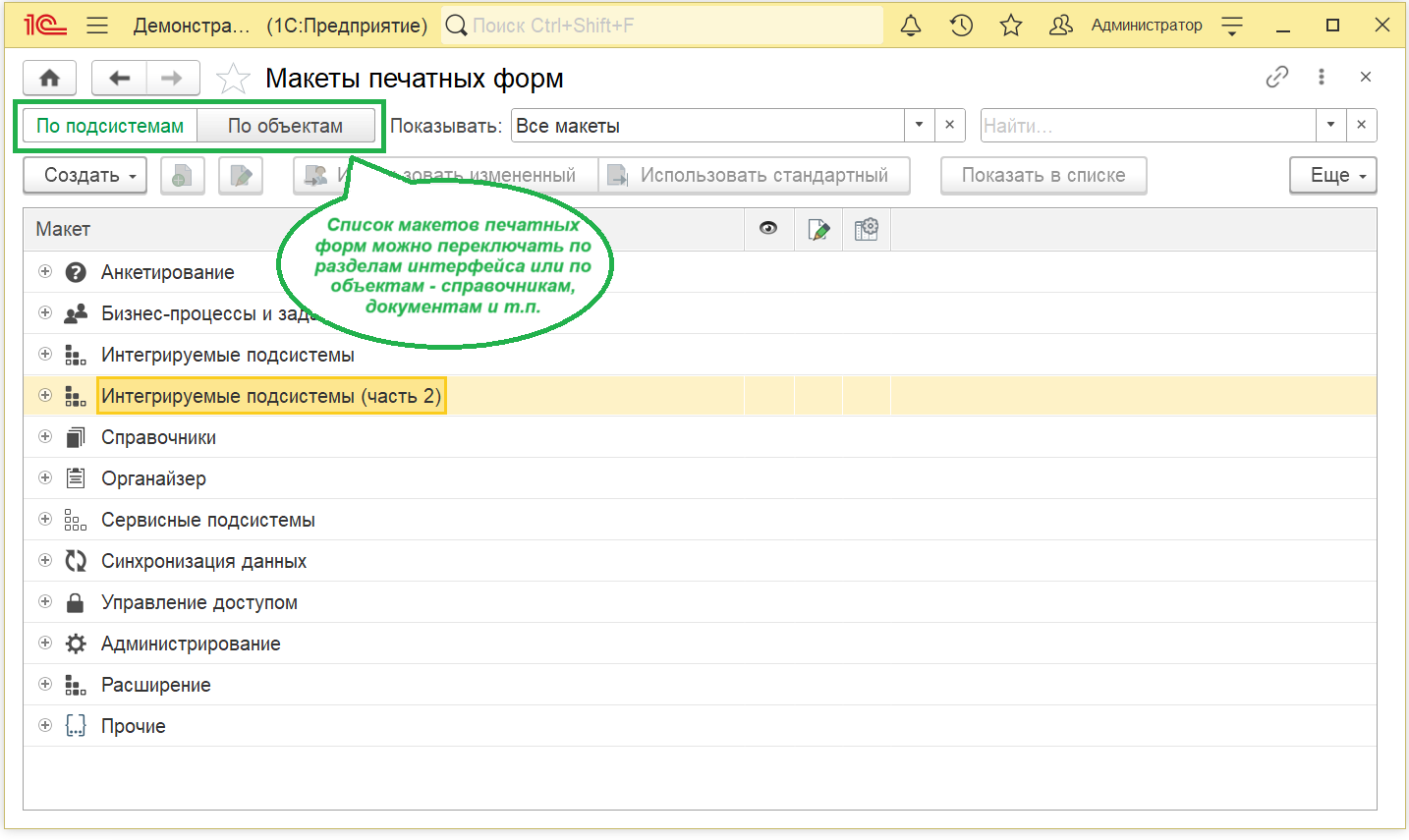 В состав библиотеки включена новая подсистема Выгрузка объектов в файлы, которая используется совместно с подсистемой Печать. Она позволяет выгружать произвольные документы, справочники и другие объекты приложения в файлы различных форматов по настраиваемым макетам. Список макетов выгрузки задается индивидуально для каждого документа в разделе Администрирование - Печатные формы, отчеты и обработки - Макеты файлов выгрузки. В макет можно включить любое поле или табличную часть в нужном порядке, указать формат выходного файла: DBF, XML, JSON, HTML, TXT, XLS, XLSX или MXL. Для выгрузки интересующего документа по макету в файл можно воспользоваться подменю Выгрузить в файл в карточке этого документа, а также в списках и журналах документов. Также можно прикрепить сформированный файл прямо к самому документу, если у него предусмотрены присоединенные файлы, или настроить шаблоны сообщений для рассылки с требуемыми макетами выгрузки. Пример настройки макетов выгрузки см. в демонстрационной базе для документа _ДемоСчетНаОплатуПокупателю.