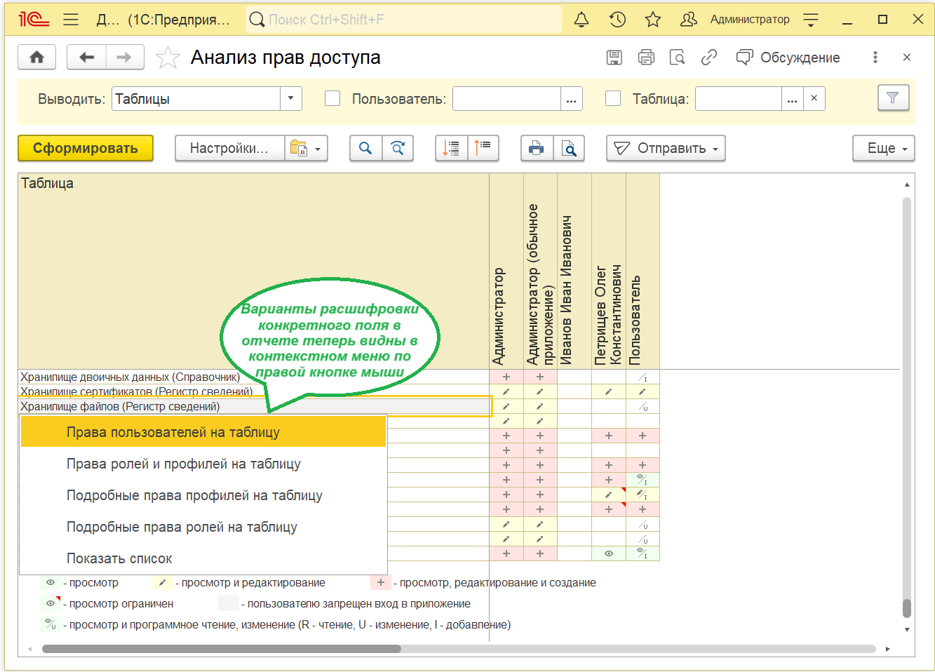 Для удобства из отчета Анализ прав доступа с помощью расшифровки по таблице можно открывать отчет Права ролей. Варианты расшифровки конкретного поля в отчете теперь видны в контекстном меню по правой кнопке мыши.