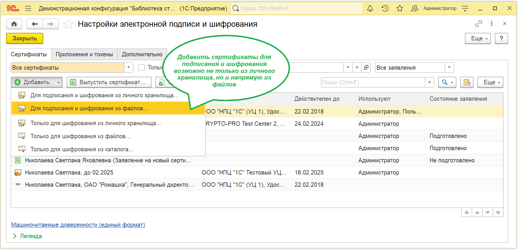 Добавлена возможность настройки ограничения доступа на уровне записей для справочника Сертификаты ключей электронной подписи и шифрования и регистра сведений Заявления на выпуск сертификатов. Настройка ограничения предусмотрена по пользователям и организациям.
