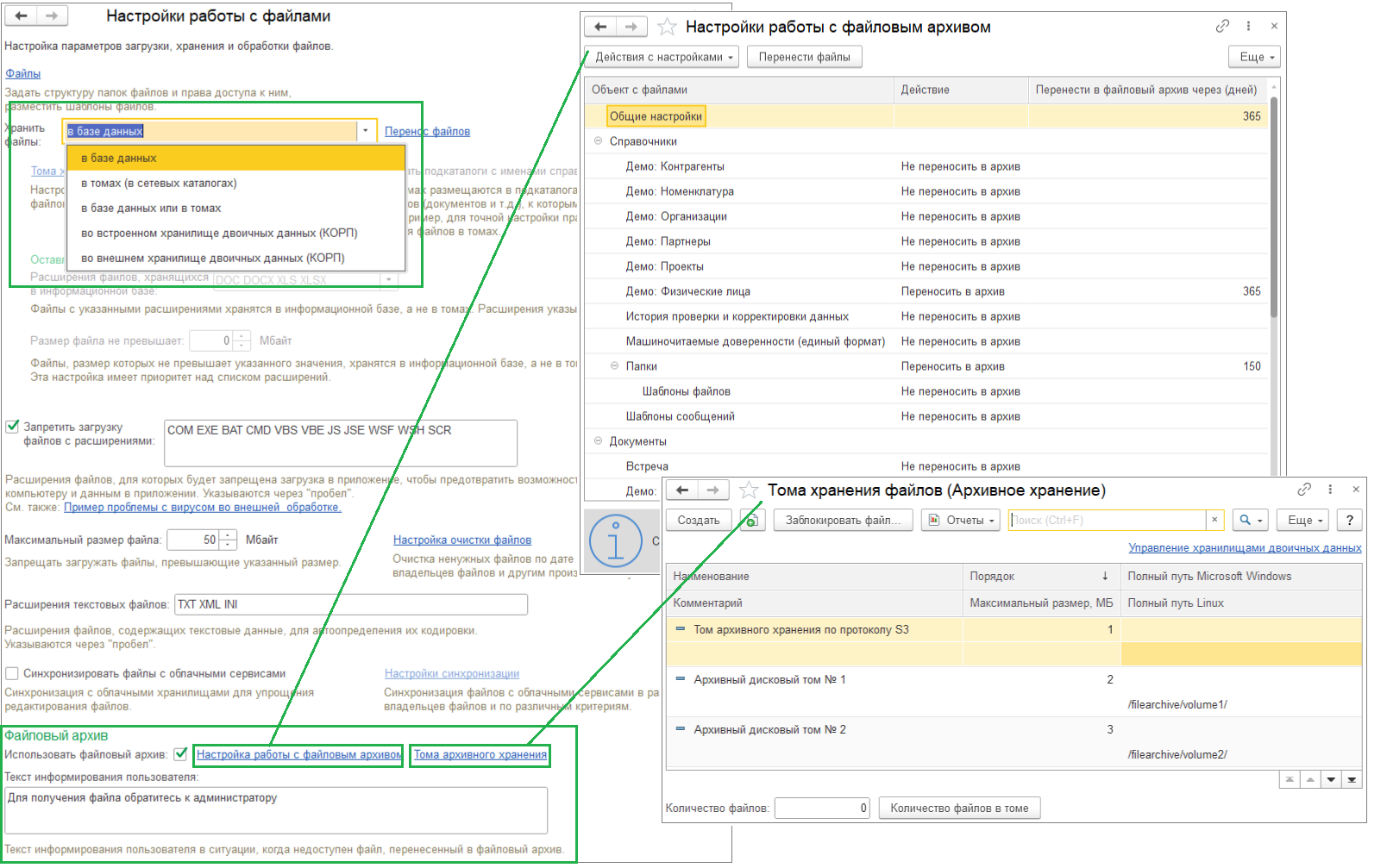 Предусмотрена возможность программного отключения механизма файлового архива в тех случаях, когда его использование в конфигурации не требуется. Для этого в параметр Настройки процедуры ПриОпределенииНастроек общего модуля РаботаСФайламиПереопределяемый добавлено свойство ДоступенФайловыйАрхив. Для отключения необходимо переопределить это свойство, установив его значение в Ложь.