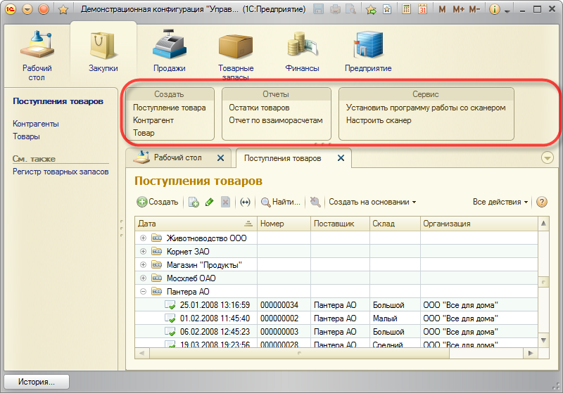 Один из стандартных элементов командного интерфейса прикладных решений. Она содержит самые востребованные и часто используемые команды, позволяющие быстро создавать новые объекты базы данных, выполнять обработки или строить отчёты.
