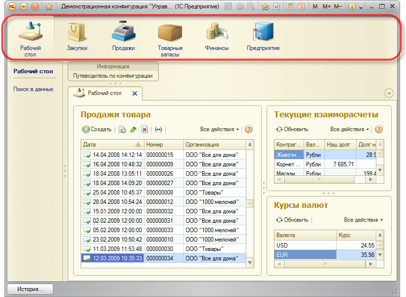 Один из стандартных элементов командного интерфейса прикладных решений. Она показывает основную, главную структуру прикладного решения и позволяет перемещаться между разделами программы.