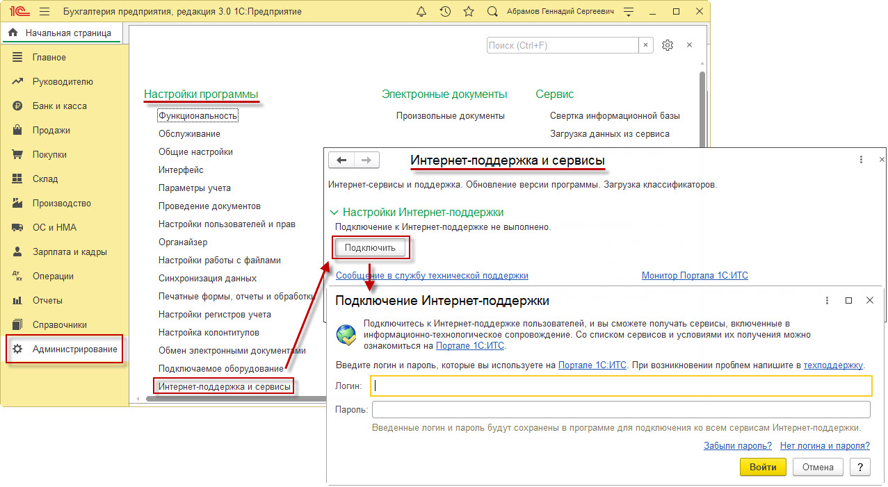 - Логин - логин, полученный при регистрации на Портале 1С:ИТС,