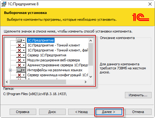 - Размер дистрибутива платформы 1С:Предприятие, который будет загружен на компьютер,