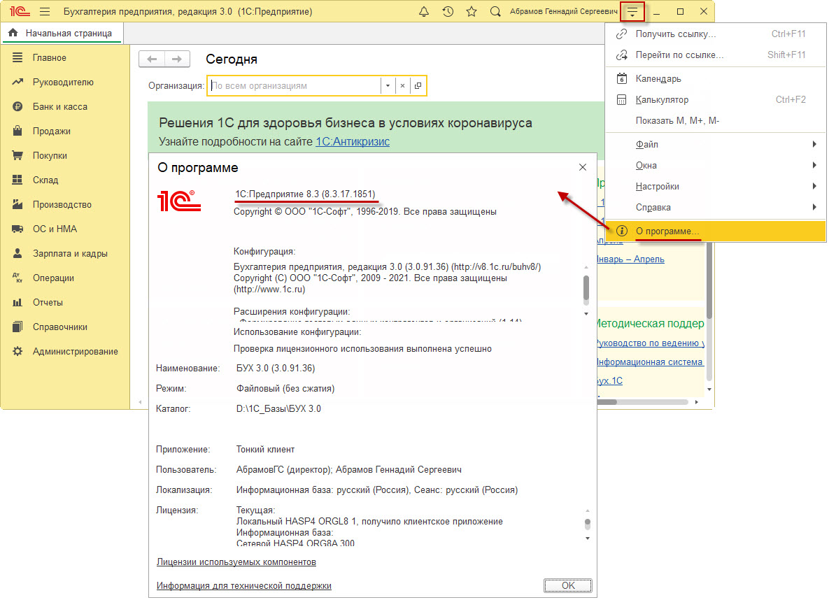 В пользовательском режиме любого программного продукта можно проверить номер платформы, используя